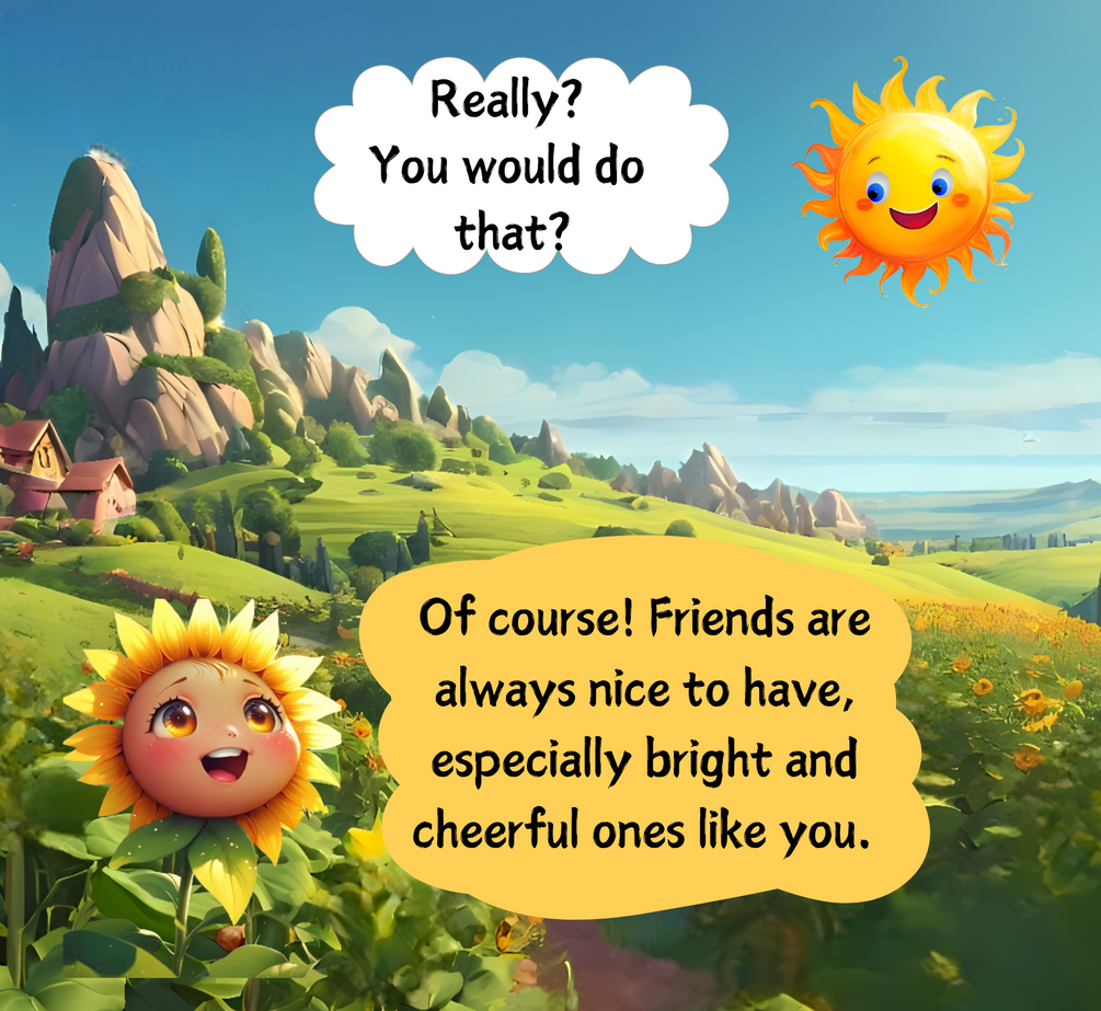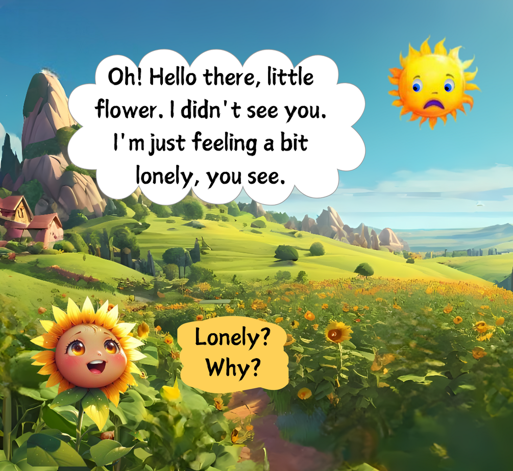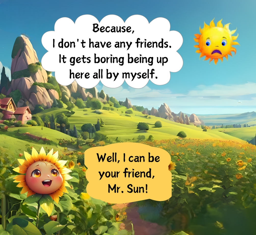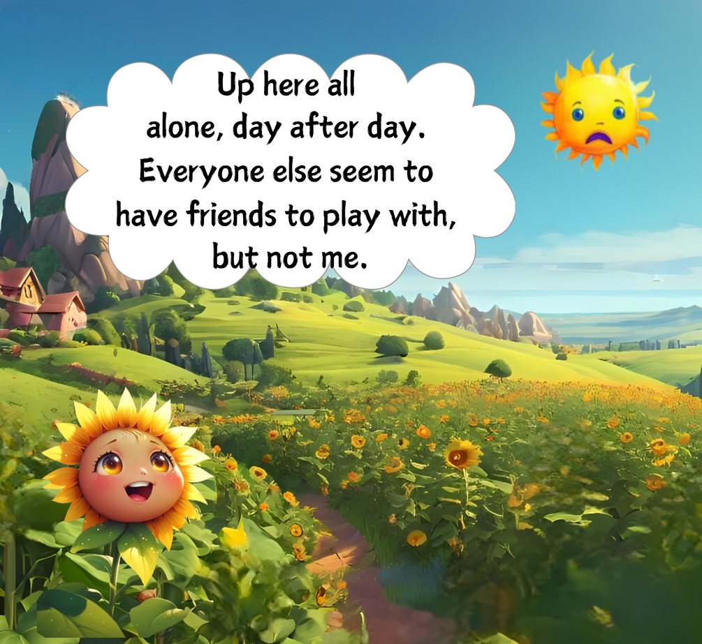 "The Sun feels sad and all alone in the big sky. But look! A happy sunflower waves hello! They start chatting about the adventures they have everyday and become best of friends. Are they still friends? Read this book and find out!